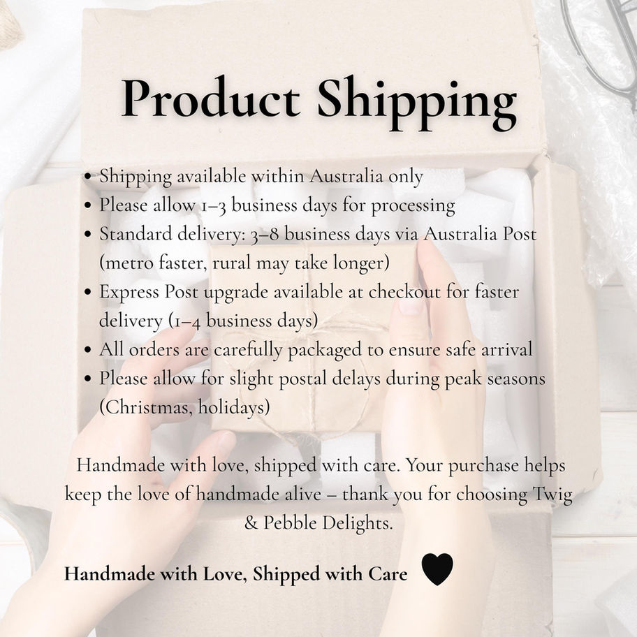 Your privacy matters to us. We only use your personal details to process and deliver your order, or to personalise your gift message if you’ve chosen that option. Your information is never shared or sold — it stays safe with us, just between you, your keepsake, and our little handmade studio.